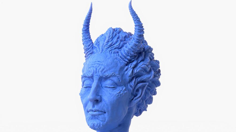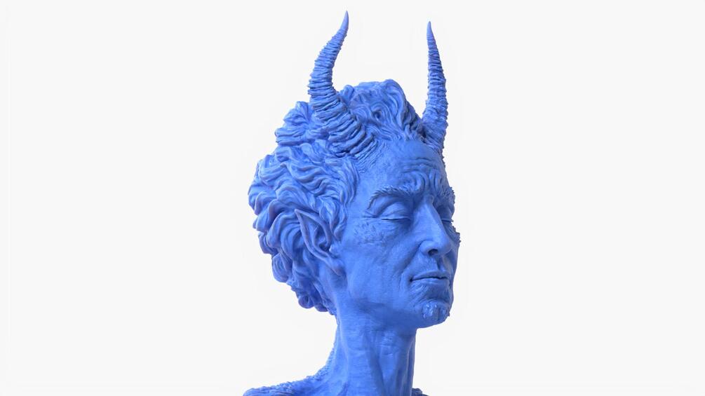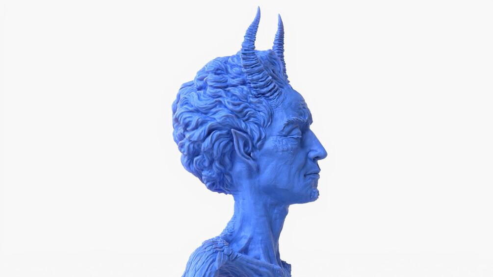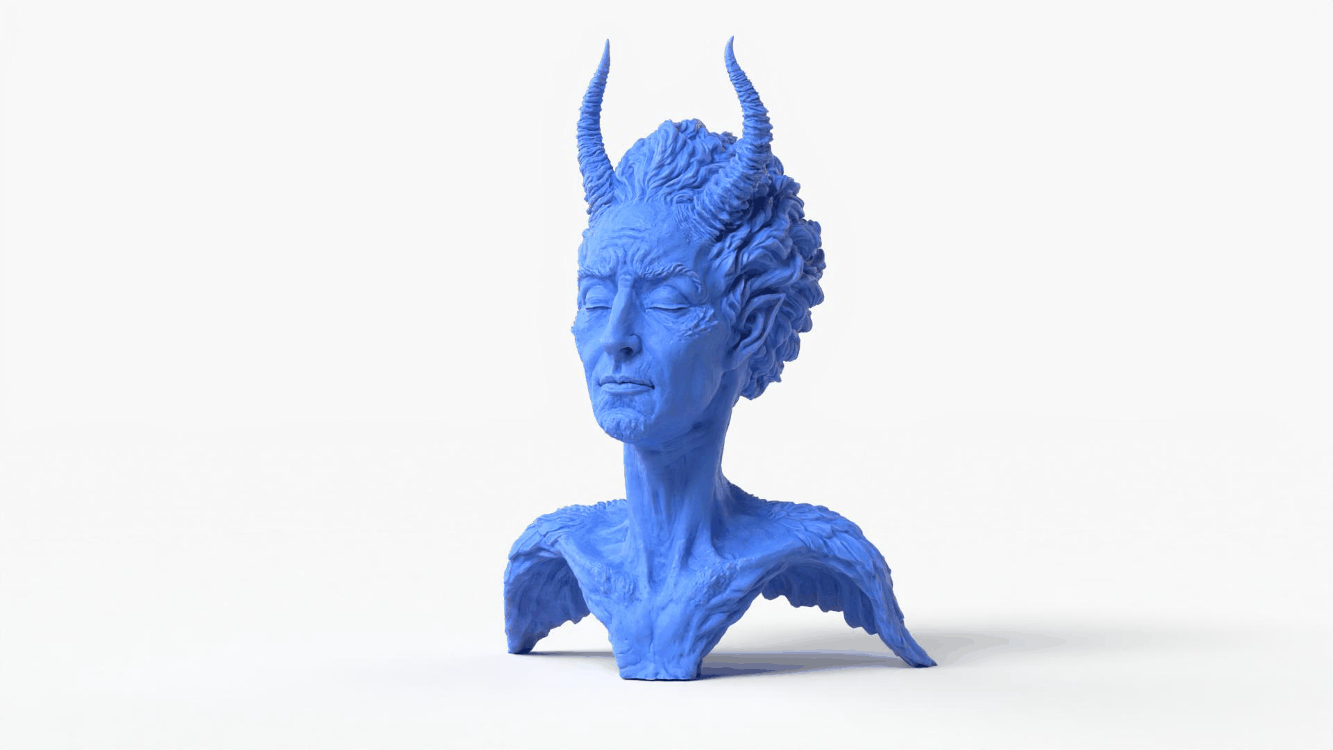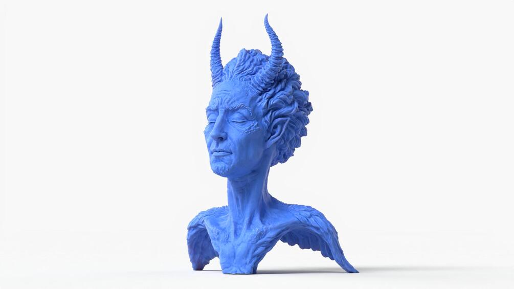 Unique artistic sculpture of a bust character featuring horns and angel wings, representing the duality of angel and demon.
